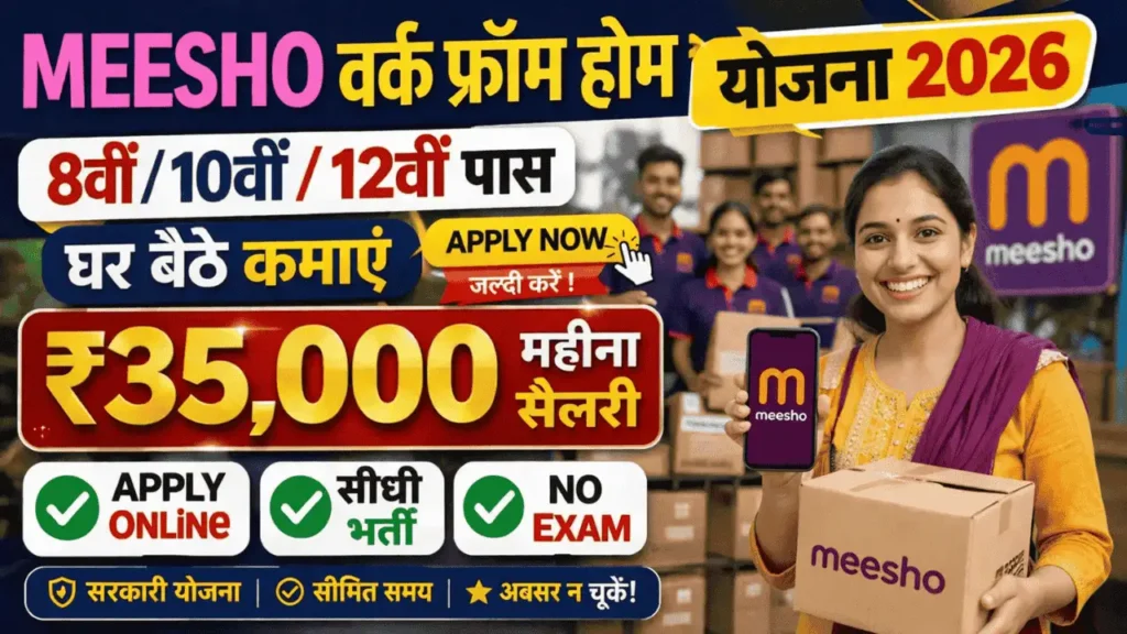 देश के युवाओं के लिए एक और बड़ी अपडेट सामने आ रही है। Meesho Work From Home Yojana 2026 को लेकर चर्चा तेज है, जिसमें बताया जा रहा है कि 10वीं–12वीं पास युवा घर बैठे काम करके हर महीने ₹35,000 तक कमा सकते हैं। खास बात यह भी बताई जा रही है कि चयन प्रक्रिया आसान होगी और कई कामों में इंटरव्यू की जरूरत भी नहीं होगी।